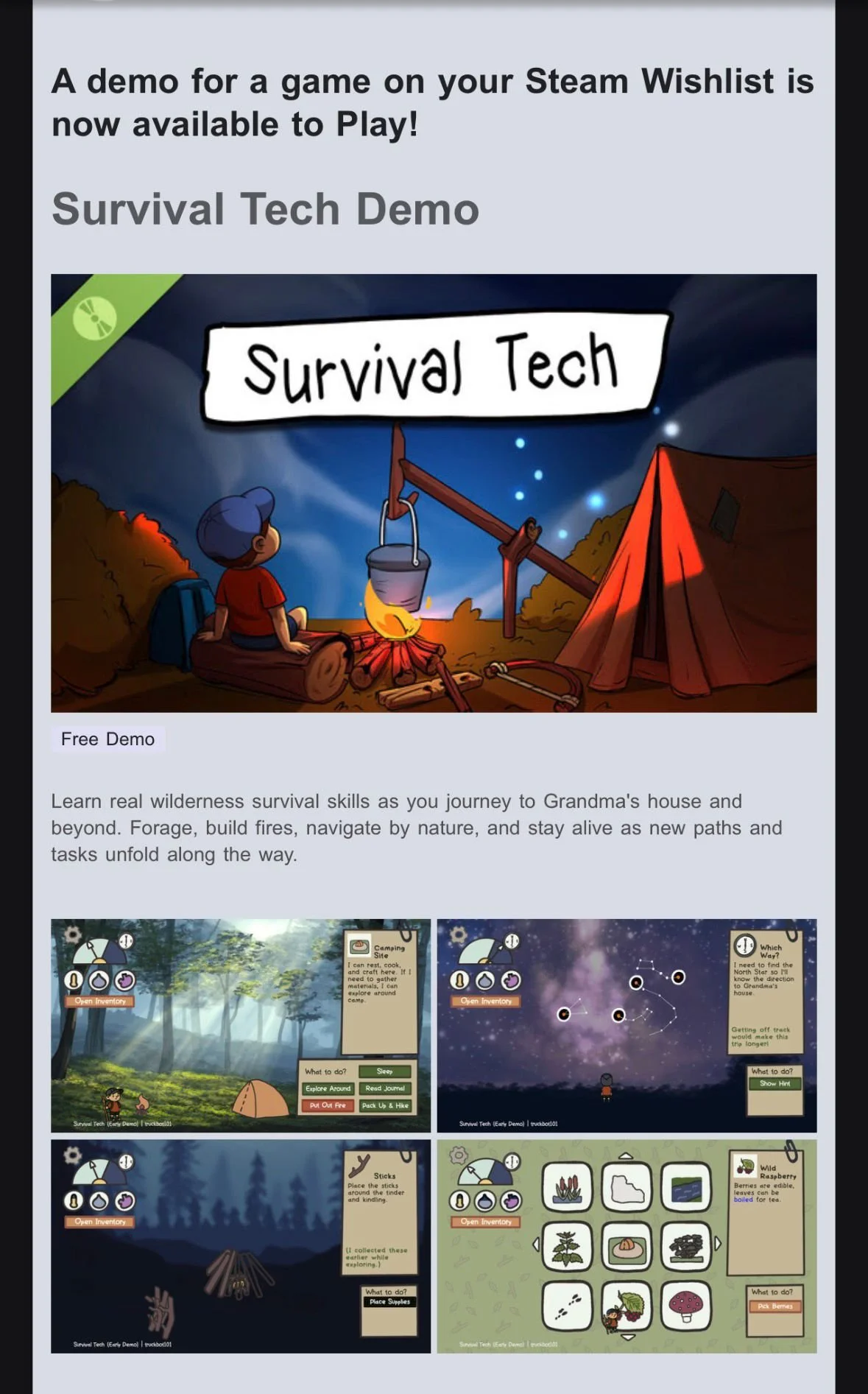 But enough talk! You can play the demo here!: https://store.steampowered.com/app/4455360/Survival_Tech_Demo/